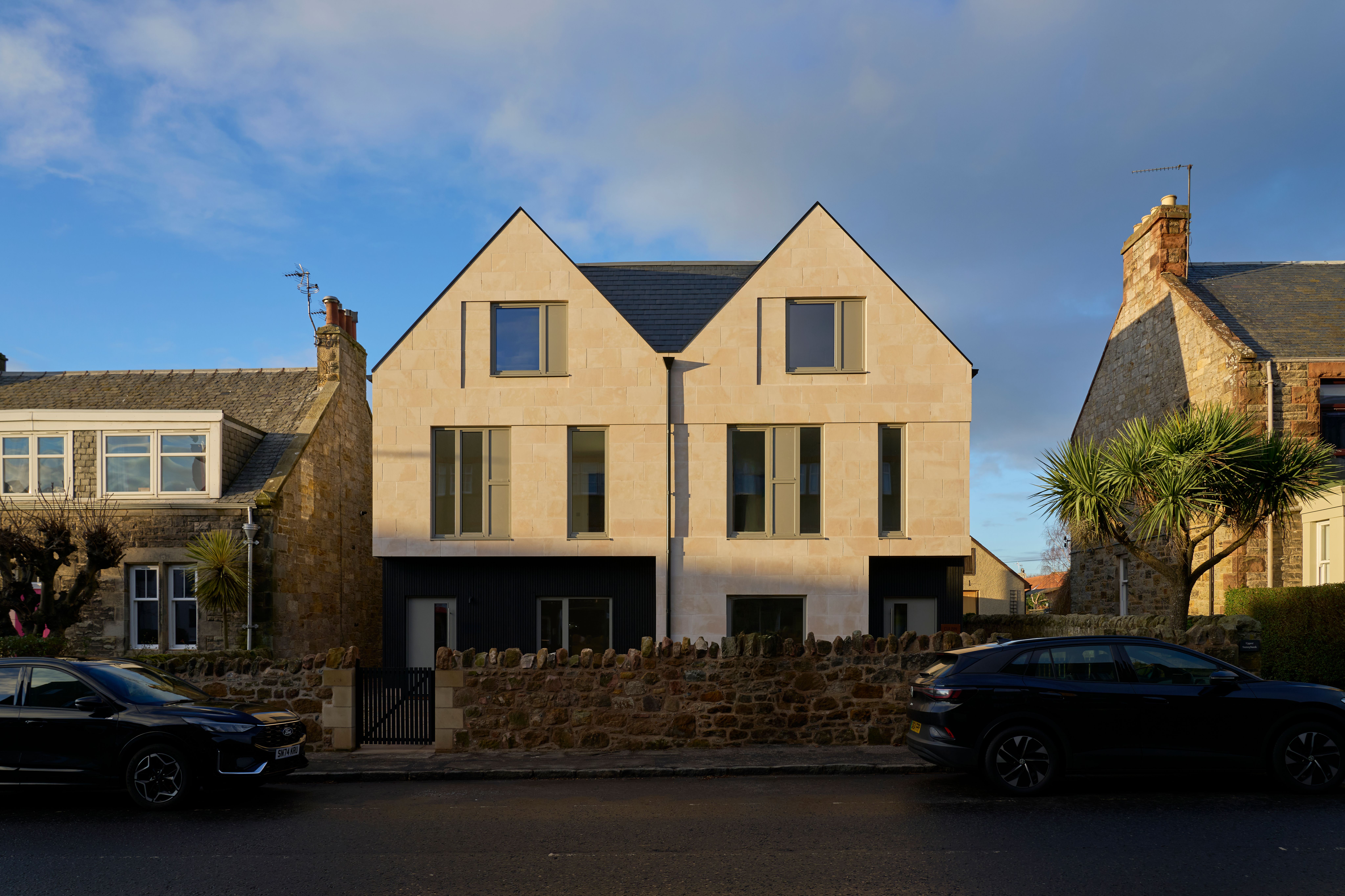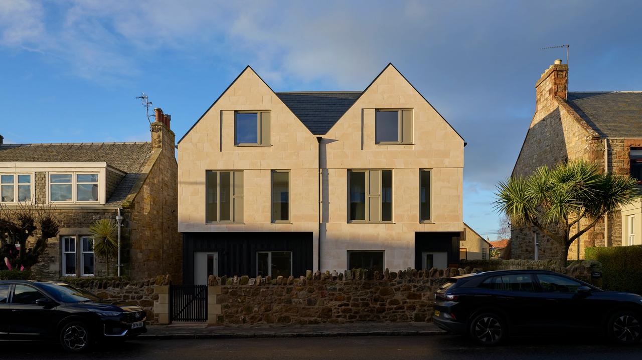 Two new-build houses on a prominent plot on Gullane High Street, built to passive house standards.